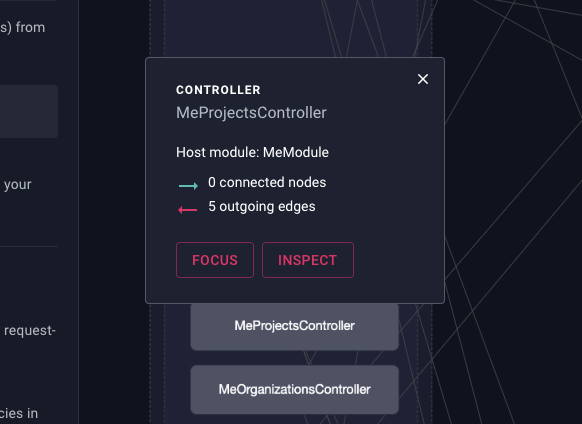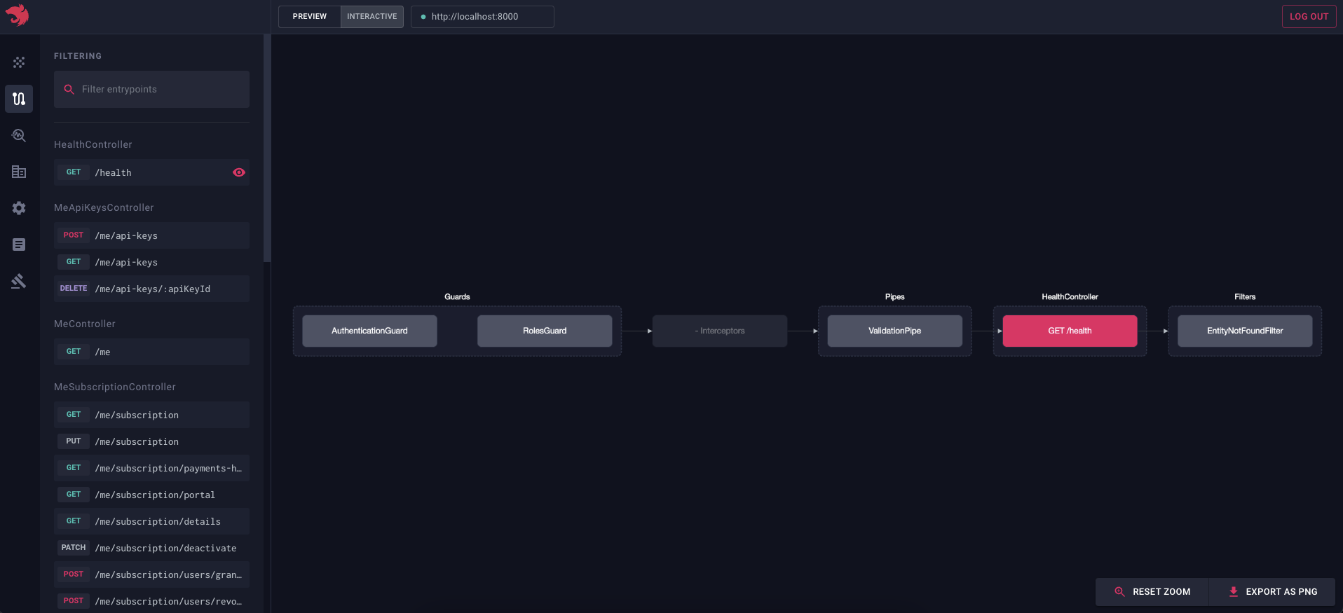 Si vous cliquez sur un point d'entrée spécifique, un graphique de flux s'affiche. Ce graphique montre le flux d'exécution du point d'entrée (par exemple, les gardiens, les intercepteurs, les tuyaux, etc. liés à cette route). Ceci est particulièrement utile lorsque vous voulez comprendre comment le cycle requête/réponse se présente pour une route spécifique, ou lorsque vous cherchez à savoir pourquoi un garde/intercepteur/pipe spécifique n'est pas exécuté.