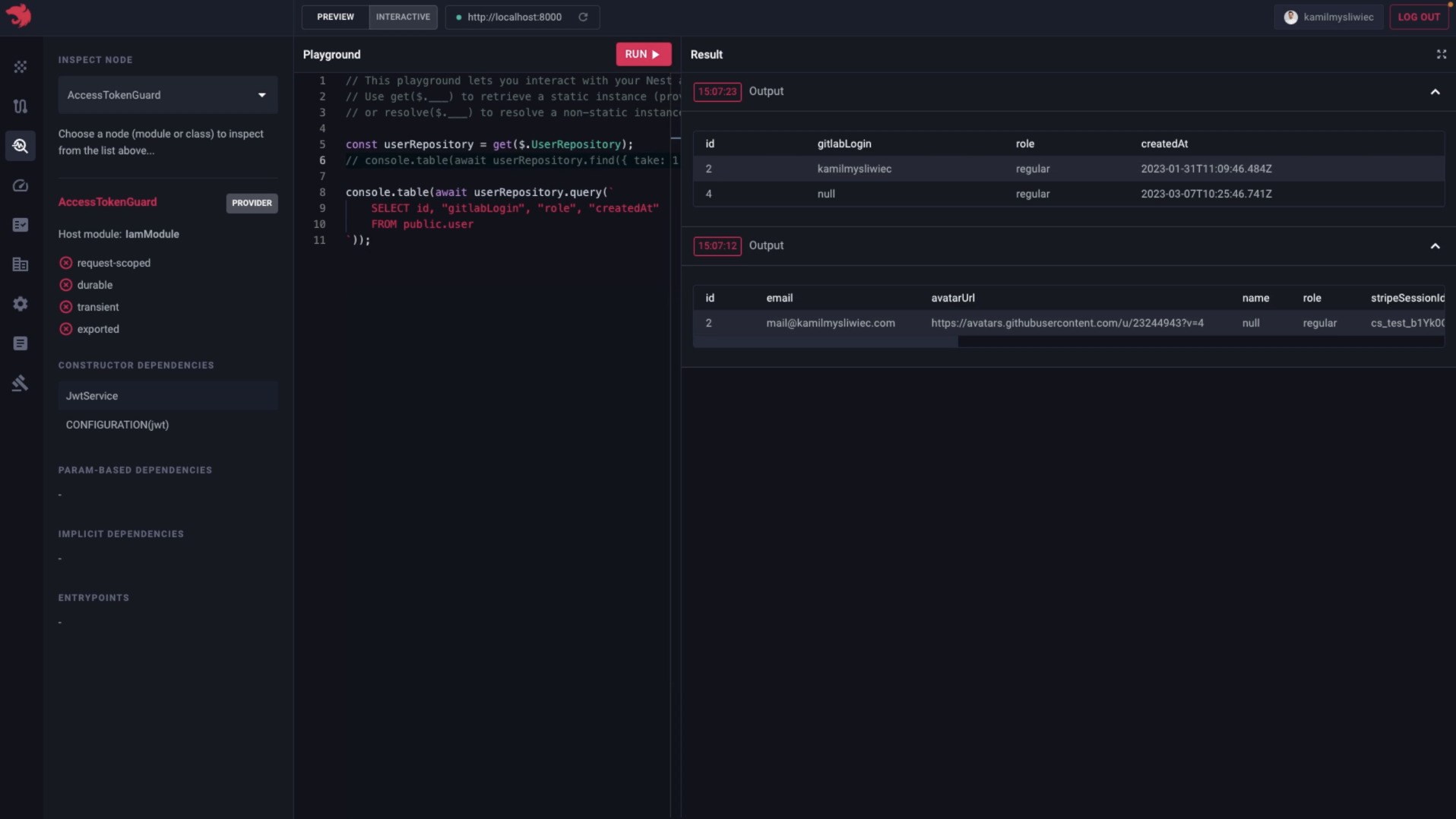Le terrain de jeu peut être utilisé pour tester et débugger les points d'extrémité de l'API en temps réel, ce qui permet aux développeurs d'identifier et de corriger rapidement les problèmes sans utiliser, par exemple, un client HTTP. Nous pouvons également contourner la couche d'authentification, de sorte que nous n'avons plus besoin de cette étape supplémentaire de connexion, ni même d'un compte d'utilisateur spécial à des fins de test. Pour les applications événementielles, nous pouvons également déclencher des événements directement à partir du terrain de jeu et voir comment l'application y réagit.