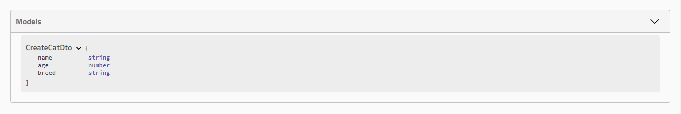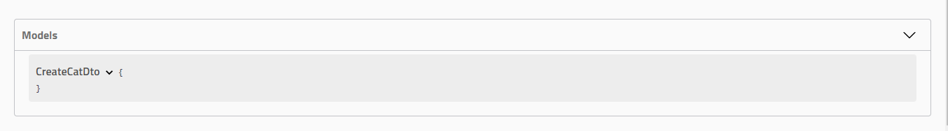 Ouvrons le navigateur et vérifions le modèle CreateCatDto généré :